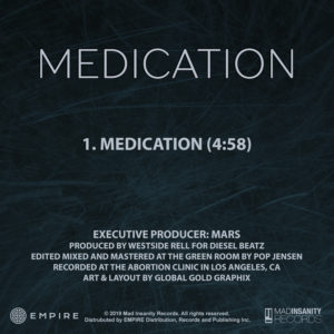 Medication will be available to everyone everywhere tomorrow! And that’s not all! Mars has more projects to come including, his upcoming collaborative album with international hardcore superstar Danny Diablo “Devils And Demons.” And “Locked Up A Broad” LP both dropping on Force 5 Records along with a project produced by Bvne called the “Murder EP”. 2019 marks the year of Mars hustle that has garnered his legendary status in the scene.