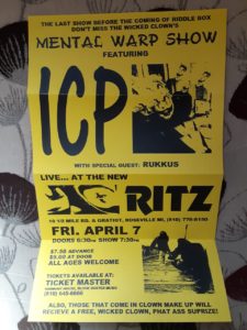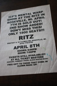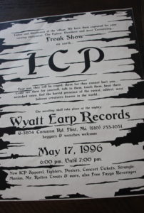 Ok, I suppose we could get stuck in 1995 for a minute, so instead of hitting every single milla-second, like I said before, I’m just going to be-bop around, hitting on points that I remember well. The year nineteen ninety six was a good year because that was the year that I came face to face with the Wicked Clownz for the first time. I will never forget that day and I even saved the flyer, from the in-store meet and greet at Wyatt Earp Records. The ICP were coming to Flint to support the Juggalos in the area, sign autographs, and allow the Juggalos to get up close and personal with their gods.