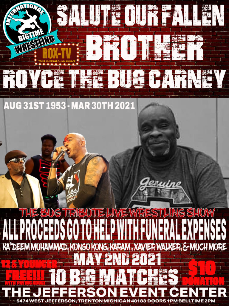 The news came down yesterday that ROYCE “THE BUG” CARNEY has passed away, very unexpectedly and without advance warning. It was a shocking piece of information that caught everyone who loved “The Bug” off guard and sent friends and family reeling. Words can not describe the pain and the heartache that is felt for the loss of our friend, who was a great family man and an ICON in the Detroit Wrestling world and beyond.