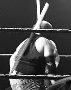I apologize ahead of time for not being a seasoned sports reporter, I’m just a Juggalo so catching every bone chilling moment and correct spelling of the wrestler’s middle names is not what I do. I merely absorb and try to hold on. I believe the second match had a pretty far out looking punk rocker with a vibrant mohawk. If I remember correctly, he came out with some wild ass looking bat, duct taped with thirty feet of barbed wire, or that’s what it looked like to me. Whatever it was, I wouldn’t want to be clocked in the head with it. His opponent came roaring out and the match soon began.