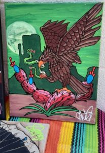 Sometimes if I get an idea, I like to sketch it out on paper. Most of the time I just wing it and throw some paint down and go from there. I’m a real big fan of Tim Burton. So I love to paint Nightmare before Christmas. But a lot of my own art is inspired by Mexican culture.