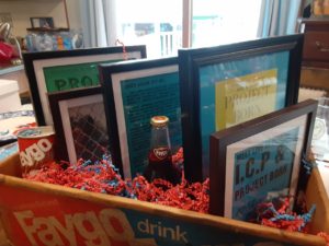 The items that I selected to be put into the raffle basket, which was technically a fifty year old carrying box from FAYGO (built for 24 1/2 liter bottles) in Detroit. I had recently located the Faygo box in the Upper Peninsula and couldn’t walk away from it, once I had laid eyes on the old beauty. I originally had no intentions of parting with it, but it fit perfectly with what I was trying to do so it was sacrificed for the mission.
