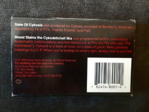 The inside held the tape, and the cassette was actually stamped “made in the USA” (what a novel fucking idea that was). Instead of side one and two, it said “In your mind” (side) “Blood stains cykodelichell mix”. The side featuring “In your soul” had “State of Cykosis” on it. I kept on looking and observing but knew that this tape was “mine” and eventually paid Doug for it.