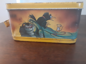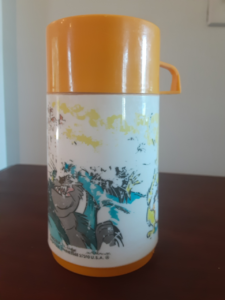 The lunch box shown above is from my private collection and still has the thermos inside. This is an example of a “rough condition” lunchbox and time has not been kind. Besides some denting and rusting, the thermos graphic is almost completely worn away. Although the 1982 trademark can still be observed. I would place an example in this condition around the $15-$25 dollar range.