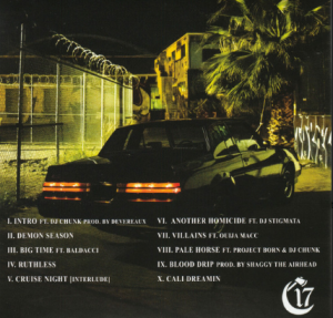 By the name you already know what kind of music is headed your way. HEXXX and the songs he creates are so put together and correct in that CALI vibe, it’s an unmistakable sound that hip hop heads know well. The other tracks and this song scream W.C.W.S. so hard. A perfect blending of CALI and Detroit inspired styles and content. It pays homage to the world that Insane Clown Posse created, while maintaining a firm identity in that CALI hardcore barrio music. So far, not a bad moment on the album. I’m sure it was only going to get better though and listened on. Taking drags off the Purple Haze now and again. I mixed in some Russian Snow just for the hell of it. My eyes were as red as the sun. DJ Stigmata appeared on this track as well.