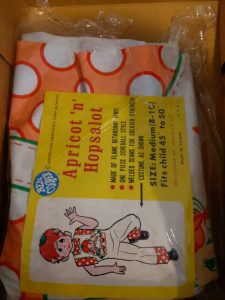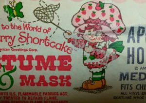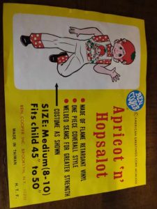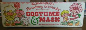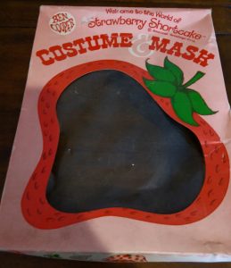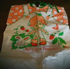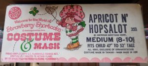 So, tonight’s costume would have been a considered a “girls” costume in the eighties. The character is from a very popular cartoon from the time called “Strawberry Shortcake” and if there are any ladies over the age of thirty-five in the room, I bet they know it well. I didn’t watch the cartoon because of the girl designation, but I was aware of it. The show was popular and so the merchandise machine started filling the gaps. The market was flooded with the main star of the show, but there was a cool thing that happened. One of the lesser known “side” characters was made into a costume. I find that very interesting, when the second string gets a chance, which I would argue is just as rare today as it was back then. The personality picked for a small chance was “Apricot”. A minor role holder, which I’m sure also had fewer costumes made and released than Strawberry Shortcake. In my collecting mind, those side-note items are always going to be rarer than others because less people wanted them back then so theoretically less survived today.