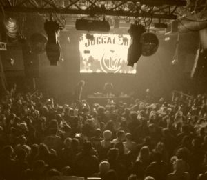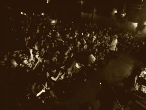 “I knew I was in trouble walking down the stairs with Darby’s backpack. It was a decent size and loaded. The problem was the place was so crowded I had to carry it in front of me against my chest. After reaching the bottom of the stairs, I was faced with the horror of wading into a six foot tall sea of humanity. That’s all I can say. It was dick to ass, tits to chest, almost no ability to not smash into total strangers. Thank God everybody was so cool about it. The crowd pushed and pulled, without much progress. At one point the crowd surged and I found myself smashed against a lady and some guy. I was fully aware that her tits were smashed into my arm, but there was nothing anyone could do. I looked at her as if to say sorry, but it wasn’t needed. She understood just like everyone else…we were in a tough spot. I managed to get another 8 feet before the miniscule trail on the floor was swallowed up by flesh. I wanted to scream but it wouldn’t have done any good. With Ouija and Chunk dropping Megatron bombs, no one could hear anything else. During the 17th minute of dying in the sea, I started to get worried. My knees felt weak and I knew I had to move or die. I wasn’t going down in this crowd, it might have been impossible to get up (dramatic description, I’m sure someone would have helped me, but it was that live in there). Another five minutes of pushing and I reached safety”.