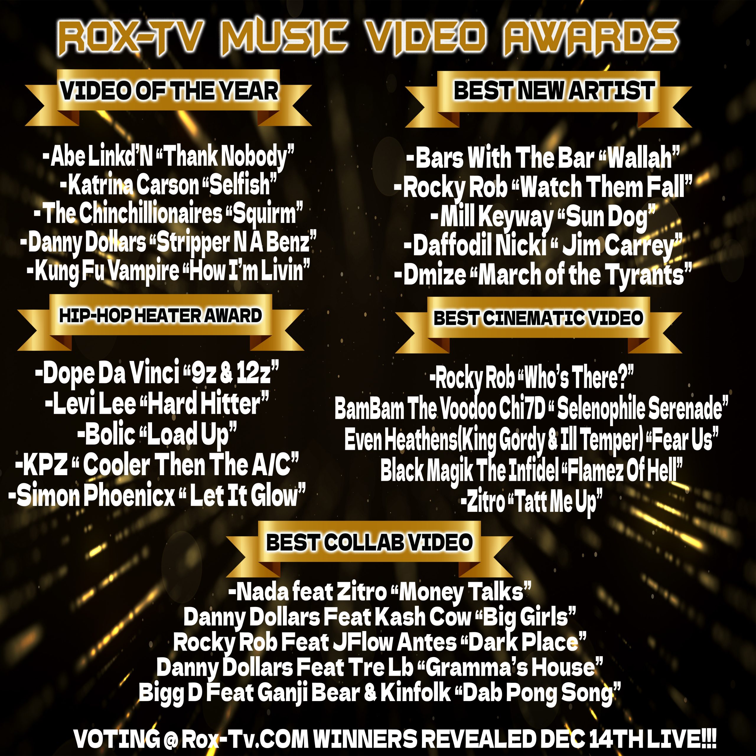 The Rox-TV Music Video Awards are here! Celebrate the best in music video production as we honor outstanding achievements in categories like Video of the Year, Best New Artist, Hip-Hop Heater Award, Best Cinematic Video, and Best Collab Video.
